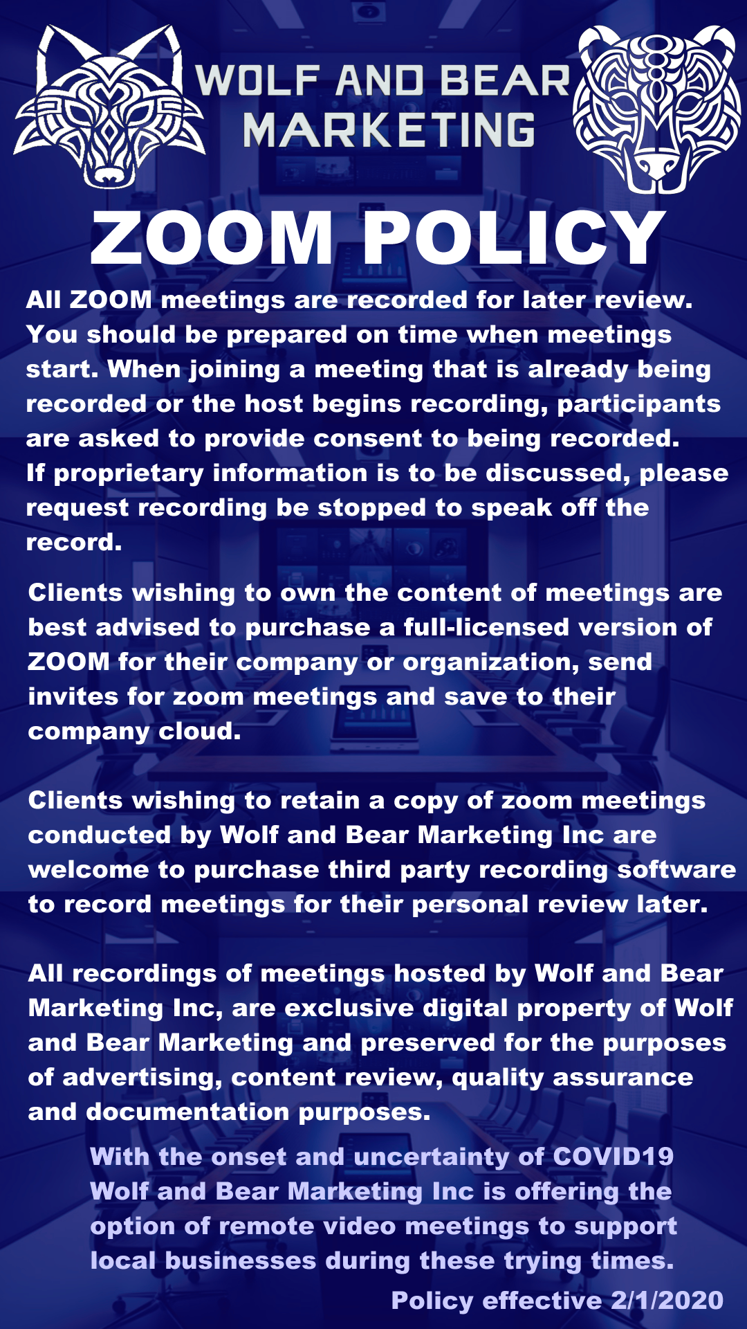 All meeting recordings hosted by Wolf and Bear Marketing Inc, are digital property of Wolf and Bear Marketing and preserved for the purposes